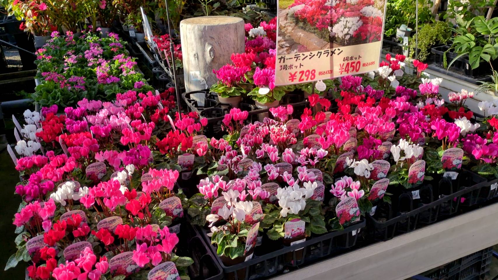 いつもホームページをご覧いただきありがとうございます。 ガーデンシクラメンの苗が好評発売中です。 赤やピンクといった可愛らしいカラーが特徴のシクラメンです。
